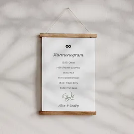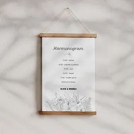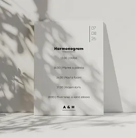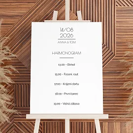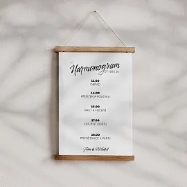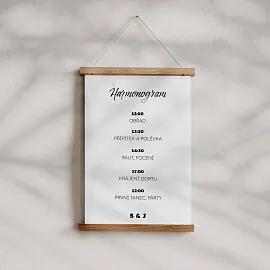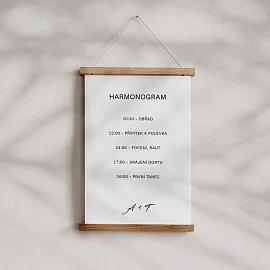 Ať si svůj velký den užiješ naplno a vždy s přehledem. Svatební harmonogram tiskneme na kvalitní grafické papíry ve třech variantách. Vybrat si můžeš ze tří formátů (30 × 45, 40 × 60 nebo 60 × 90 cm) a provedení jako plakát, na kapa desce nebo v dřevěných lištách. Harmonogram si snadno navrhneš v našem online editoru a sladíš ho s dalšími svatebními tiskovinami ❤